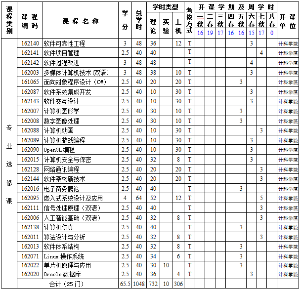 選修課(包括專業(yè)選修課和公共選修課)須修滿29學(xué)分。學(xué)生應(yīng)在下列專業(yè)選修課程中修滿19學(xué)分;公共選修課的設(shè)置由學(xué)校提供。