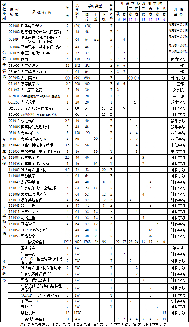 2.學(xué)位課程:馬克思主義基本原理、大學(xué)英語(yǔ)、高等數(shù)學(xué)、C與C++語(yǔ)言程序設(shè)計(jì)、算法與數(shù)據(jù)結(jié)構(gòu)、電路與模擬電子技術(shù)、數(shù)字電子技術(shù)、數(shù)據(jù)庫(kù)原理及應(yīng)用、操作系統(tǒng)原理、計(jì)算機(jī)組成與系統(tǒng)結(jié)構(gòu)、TCP/IP協(xié)議分析、計(jì)算機(jī)網(wǎng)絡(luò)、網(wǎng)絡(luò)工程、網(wǎng)絡(luò)管理、網(wǎng)絡(luò)安全、軟件工程。