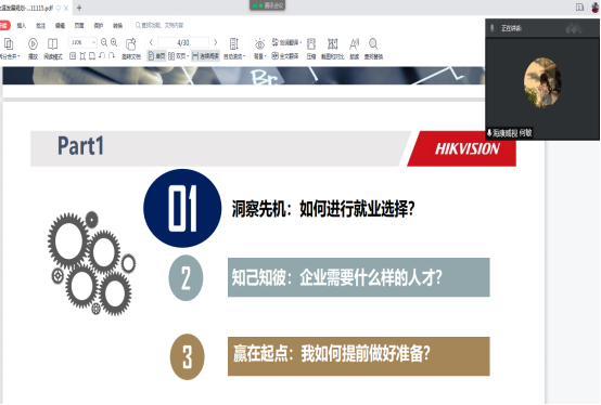 (通訊員:張穎旭、駱訓鳳)揚帆夢想,規(guī)劃職場,共筑未來。為系統(tǒng)提升大學生職業(yè)生涯規(guī)劃意識引導新生做好校園生活安排,樹立積極向上的價值觀,為實現(xiàn)充分就業(yè)、高質(zhì)量就業(yè)打好基礎(chǔ),計算機科學學院于2021年11月1719:00,開展2021級新生線上職業(yè)規(guī)劃教育,本次課程由海康威視公司何敏經(jīng)理主講2021級全體同學參與此次活動