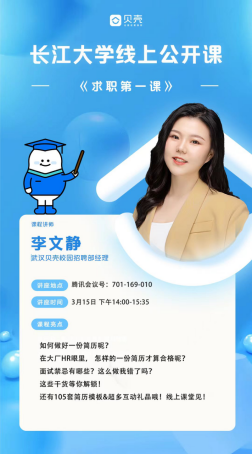 (通訊員 余珺瑞)2022年3月15日14:00,武漢貝殼找房科技有限公司校園招聘經(jīng)理李文靜受邀在騰訊會議為計算機科學(xué)學(xué)院學(xué)生開展就業(yè)指導(dǎo)講座,我院2018級近四百名學(xué)生參加。