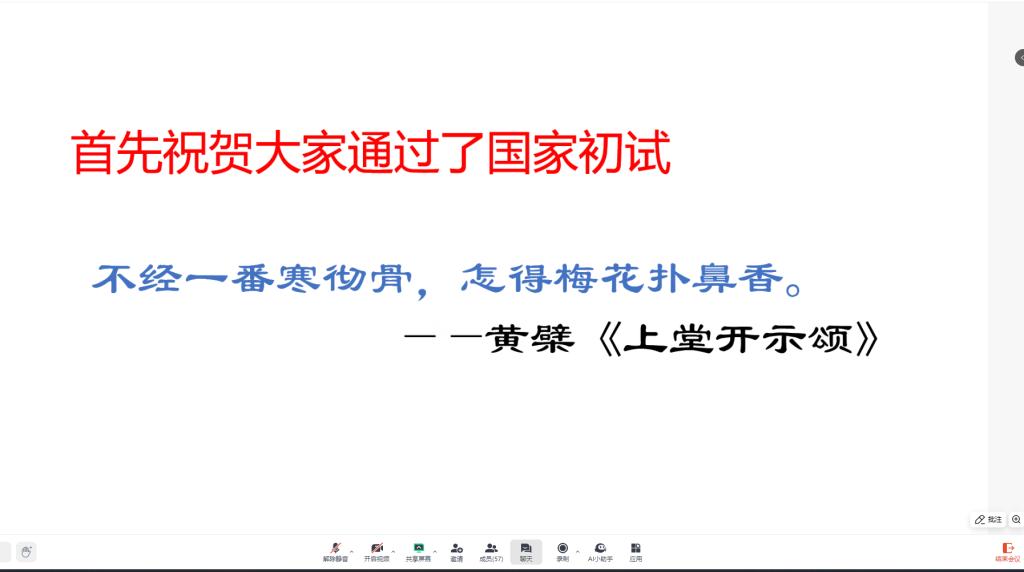 為精準(zhǔn)提升考研學(xué)子復(fù)試競(jìng)爭(zhēng)力,系統(tǒng)化解備考焦慮,3 月 14 日下午,我院成功舉辦“研途領(lǐng)航?決勝?gòu)?fù)試”專題指導(dǎo)講座。本次活動(dòng)由輔導(dǎo)員余珺瑞主持,學(xué)院黨委副書(shū)記肖彬、院長(zhǎng)助理雷鳴、2020 級(jí)優(yōu)秀校友嚴(yán)思龍、余濤等嘉賓與 70 余名考研學(xué)子云端相聚,共話復(fù)試突圍之道。 活動(dòng)伊始,雷鳴老師以 "知己知彼,百戰(zhàn)不殆" 為主題,從國(guó)家研究生擴(kuò)招政策切入,結(jié)合近年招生數(shù)據(jù),深度解析復(fù)試考察重點(diǎn)與評(píng)分標(biāo)準(zhǔn)。他特別強(qiáng)調(diào) "調(diào)劑黃金期" 的關(guān)鍵策略,建議同學(xué)們構(gòu)建 "保底+沖刺" 的復(fù)試方案矩陣,通過(guò)模擬面試、查找學(xué)校復(fù)試信息等方式提升面試成功率。 “復(fù)試是信息戰(zhàn)更是心理戰(zhàn)。”嚴(yán)思龍校友以自身復(fù)試經(jīng)歷為例,詳細(xì)拆解復(fù)試全流程的 “避坑指南”。他建議學(xué)弟學(xué)妹們?cè)趯I(yè)問(wèn)答中注重理論與實(shí)踐相結(jié)合,在英語(yǔ)口語(yǔ)測(cè)試時(shí)保持 “自信而不自負(fù)” 的狀態(tài),并現(xiàn)場(chǎng)演示了科研經(jīng)歷介紹的話術(shù)技巧。 余濤學(xué)長(zhǎng)則聚焦筆試面試的實(shí)戰(zhàn)技巧,通過(guò)典型例題解析,揭秘 “高分答案”的底層邏輯。他特別提醒同學(xué)們注意細(xì)節(jié)把控,如畢業(yè)設(shè)計(jì)的嚴(yán)謹(jǐn)性表達(dá)等,并分享了獨(dú)家整理的 "高頻問(wèn)題應(yīng)答模板"。 在互動(dòng)環(huán)節(jié),學(xué)子們就 “英語(yǔ)翻譯如何準(zhǔn)備”、“面試突發(fā)狀況應(yīng)對(duì)”等熱點(diǎn)問(wèn)題踴躍提問(wèn),三位嘉賓逐一給予針對(duì)性指導(dǎo)。會(huì)后,2021 級(jí)學(xué)生崔秭威表示:“這場(chǎng)講座就像及時(shí)雨,特別是調(diào)劑策略和面試話術(shù)部分,讓我對(duì)復(fù)試更有信心了!” 據(jù)悉,學(xué)院將持續(xù)開(kāi)展 “考研護(hù)航計(jì)劃”,通過(guò)簡(jiǎn)歷打磨、模擬面試等定制化服務(wù),助力學(xué)子順利跨越 “上岸最后一公里”。