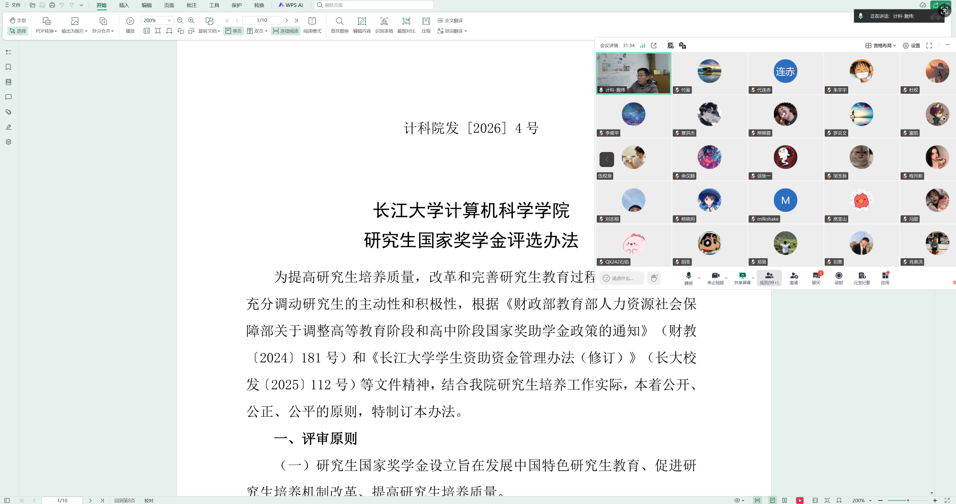 為進一步規(guī)范和優(yōu)化研究生培養(yǎng)過程中的獎助機制,計算機科學(xué)學(xué)院經(jīng)過多輪研討與學(xué)院學(xué)術(shù)委員會審議,近期對研究生學(xué)業(yè)獎學(xué)金、國家獎學(xué)金等相關(guān)重要文件進行了修訂。為幫助全體研究生及時了解最新政策,學(xué)院于2月3日上午分年級組織召開線上研究生年級大會,由副院長詹煒主講,黨委副書記艾林、輔導(dǎo)員付盈出席會議。