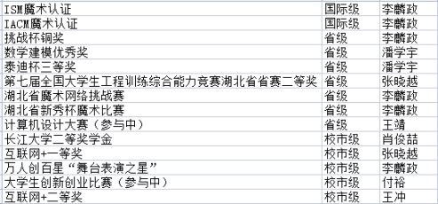 三、班級建設方面--建立核心,完善制度 開學始初,同學們通過演講競選班委,班委是民主選舉產生的,形成有效的管理機制秉持“以人為本,以班為綱”的治班理念。 班干部們以身作則,以全責為己任,密切協(xié)作,按要求完成了學校學院安排的各項任務。 一個集體就是一個家,同學們來自大江南北,有著不同的口音,有著不同的習慣,匯聚于此,一切又是那么默契,那么自然,班里每個同學都十分配合學校的各項大小事務,認真做好每一件事,爭創(chuàng)文明寢室、和諧班級。 以下是我們班同學在這一學年取得的獲獎情況(部分):