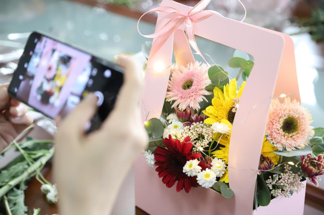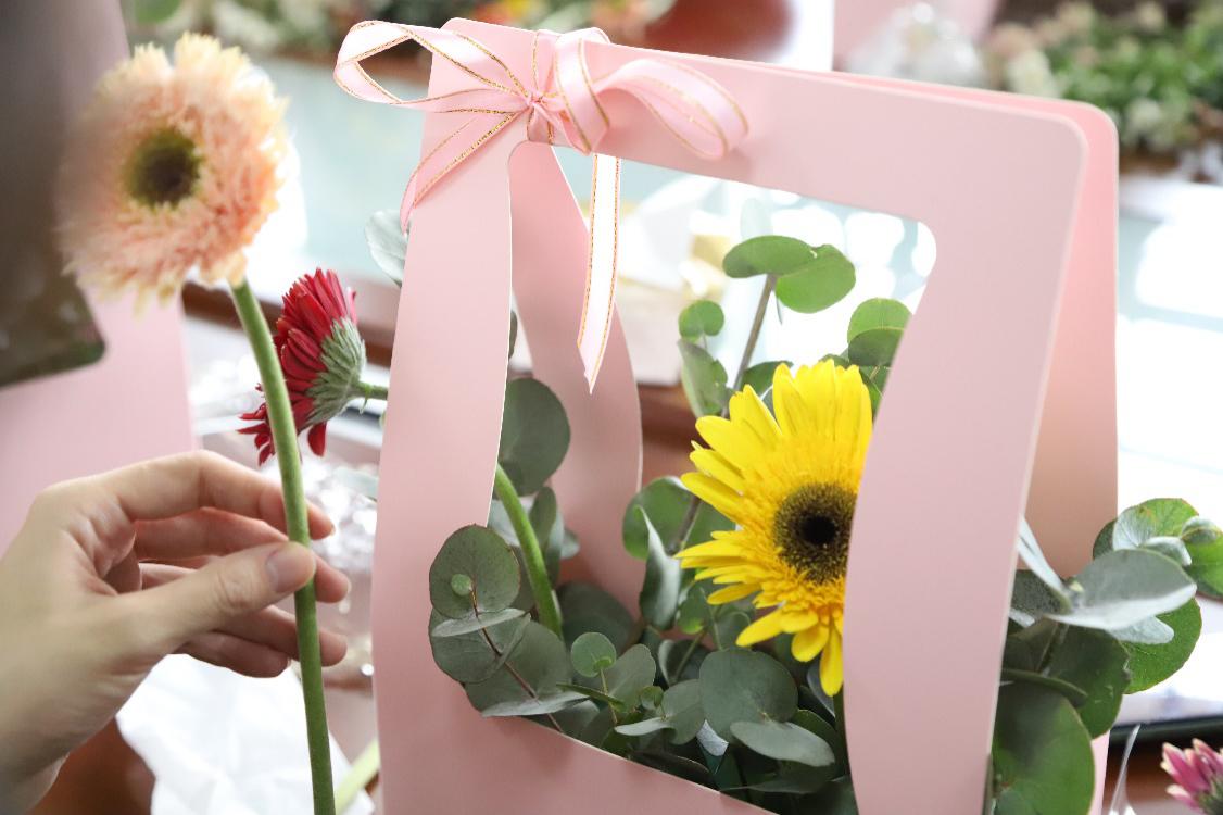 經(jīng)過一個小時的教學(xué),一支支簡單、漂亮的鮮花錯落有致地插在了花盒中,一束束獨具匠心的花藝作品生機盎然、美麗搖曳,萬紫千紅中賞花色、嗅花香,大家更是笑靨如花,幸福如花。