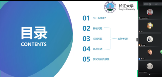 為了進(jìn)一步提升2021屆畢業(yè)生的考研熱情,明確考研目標(biāo),掌握相關(guān)考研技巧,了解更多考研信息,2020年7月7日晚18:40,學(xué)院利用騰訊會議舉行2021屆畢業(yè)生考研動(dòng)員大會,開展了線上考研經(jīng)驗(yàn)交流。學(xué)院副院長詹煒、宋文廣,黨委副書記顏學(xué)俊,學(xué)工處蔣毅,輔導(dǎo)員蘇玉容、張茜、余珺瑞,3名考上研究生的2020屆畢業(yè)生以及全體2017級學(xué)生參加了此次會議。會議由黨委副書記顏學(xué)俊主持。