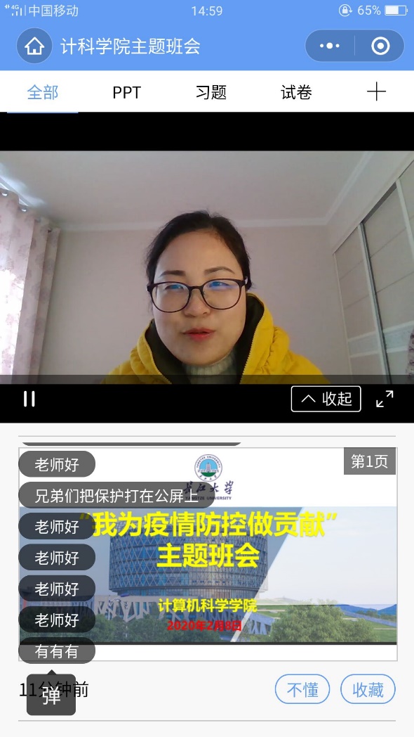在新冠肺炎疫情防控期間,為落實學校防控指揮部的各項工作要求,確保每一名學生不因疫情影響學業(yè),28日下午15:00,學院利用“雨課堂”召開了全院學生大會,學院黨委副書記顏學俊、全體輔導員、部分班主任、2000余名研究生、本科生參加大會。大會由院團委書記蘇玉容主講。