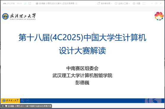2025年3月26日,武漢理工大學(xué)彭德巍副教授在騰訊會議平臺上為我校師生做了第十八屆中國大學(xué)生計算機設(shè)計大賽賽事解析和參賽指導(dǎo)。本次會議由計算機科學(xué)學(xué)院副院長陳中舉主持,報名參賽的學(xué)生和指導(dǎo)教師參加了此次會議。