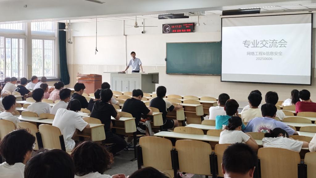 為傳承優(yōu)秀經(jīng)驗,助力學(xué)子規(guī)劃成長路徑,2025年6月6日下午2時,計算機科學(xué)學(xué)院網(wǎng)絡(luò)工程與信息安全專業(yè)交流會在12教102教室舉行。作為專業(yè)傳統(tǒng)活動,本次交流會邀請多位2025屆優(yōu)秀畢業(yè)生代表,圍繞就業(yè)、考研保研、考公考編等主題分享經(jīng)驗。學(xué)院副院長陳中舉出席并致辭,網(wǎng)絡(luò)工程、信息安全專業(yè)22級、23級學(xué)生參加,會議由邱林老師主持。