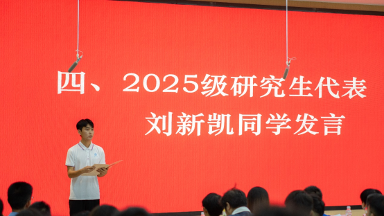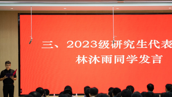 隨后,2023級(jí)研究生代表林沐雨分享了個(gè)人在科研實(shí)踐與學(xué)業(yè)探索中的心得,鼓勵(lì)學(xué)弟學(xué)妹們以“不畏挑戰(zhàn)、勇于探索”的態(tài)度,扎實(shí)走好研究生階段的每一步;2025級(jí)研究生代表劉新凱表態(tài),將以飽滿的熱情、務(wù)實(shí)的作風(fēng)投入未來(lái)的學(xué)習(xí)與科研,不負(fù)學(xué)院與導(dǎo)師的期待。