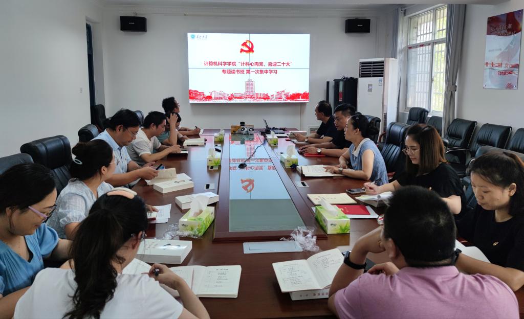 為學(xué)習(xí)貫徹落實習(xí)近平總書記重要講話精神,強化黨員干部政治理論水平,提升其履職盡責(zé)能力,學(xué)院黨委開展“計科心向黨,喜迎二十大”專題讀書班活動。9月15日下午,讀書班在4教307會議室開展第一次集中學(xué)習(xí)。學(xué)院黨委成員、學(xué)院科級及以上干部、支部書記及委員參加了此次活動。